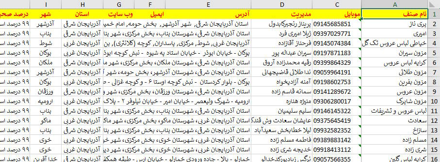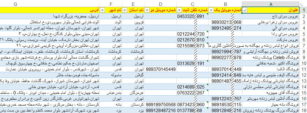 - تعداد: 7708 رکورد شامل عنوان، آدرس، نام استان، نام شهر، شماره موبایل و شماره تلفن